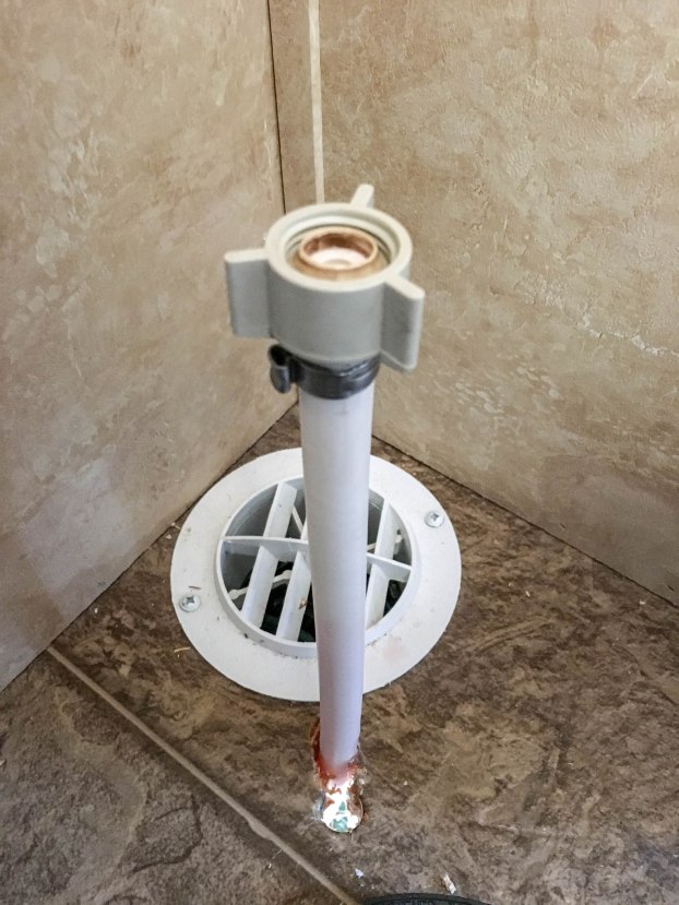 How hard can it be right? (Famous last words I assure you). Let me tell you, manufacturers of these things give you ALL KINDS of dimensions on what it will fit, where the plumbing fittings are etc. … but … well hell, not for ours. They give you dims on the centerline of the base, how far back to the wall you need, how far to the side you need … ALL FINE AND DANDY … BUT… what if your installation is in a corner … diagonally placed? Well, thankfully I could make a few adjustments to where the water line comes thru the floor, I only needed about an inch and a half. And the floor plate thankfully I could move a half inch or so. But we made it work.