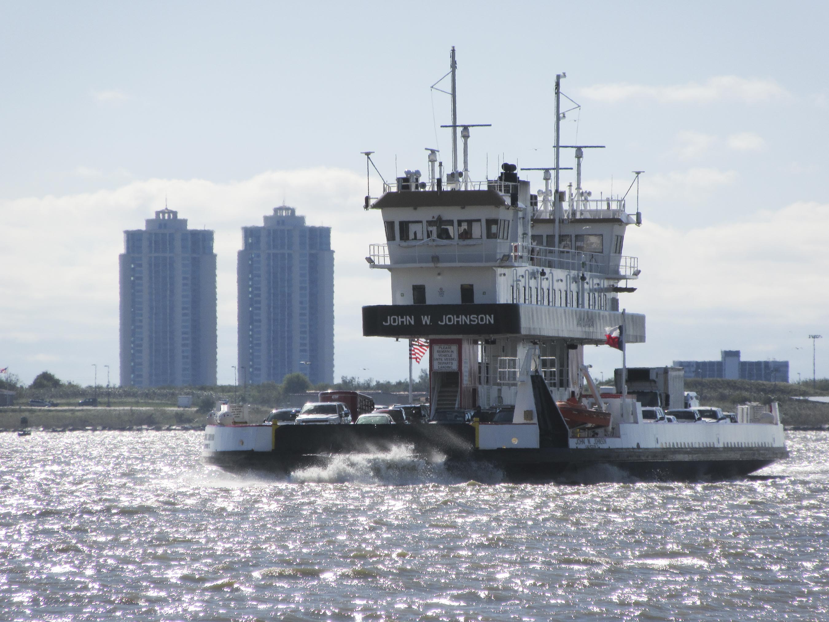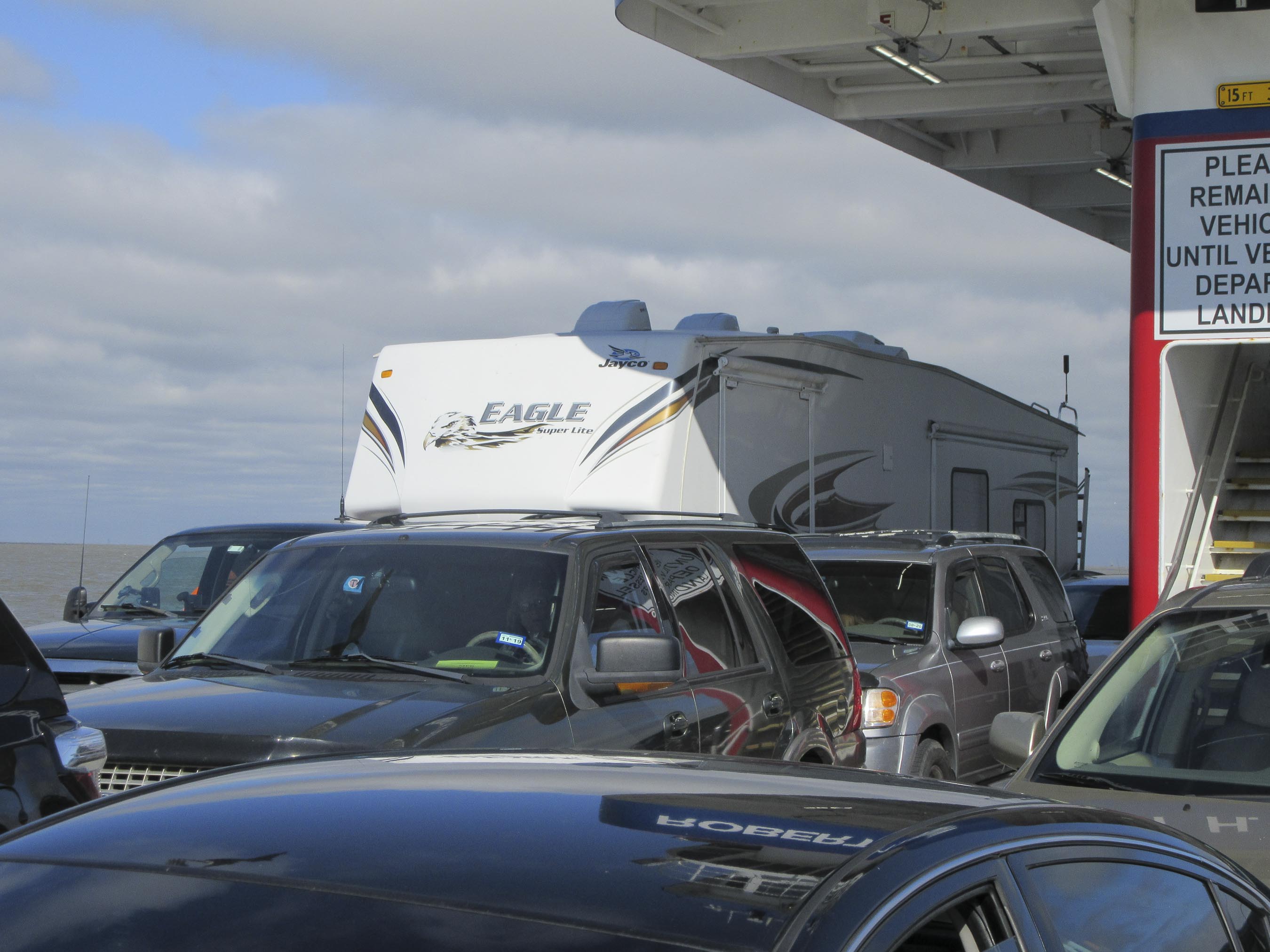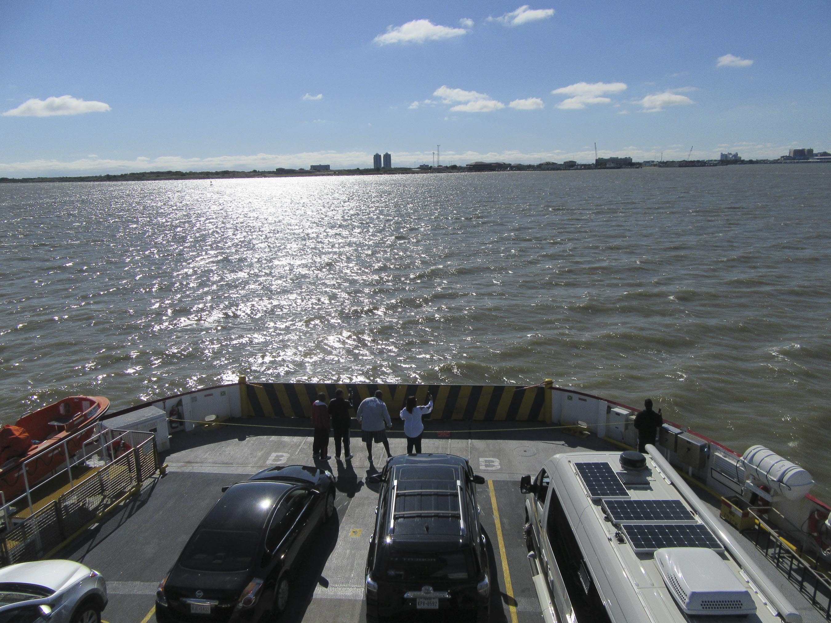 To get here we had to take the Galveston-Port Bolivar Ferry. We were a little nervous, but it turned out to be fun. We did learn that you can’t take containers of gas or diesel on to the ferry, so we, um, didn’t … (that’s our story and we’re sticking to it).