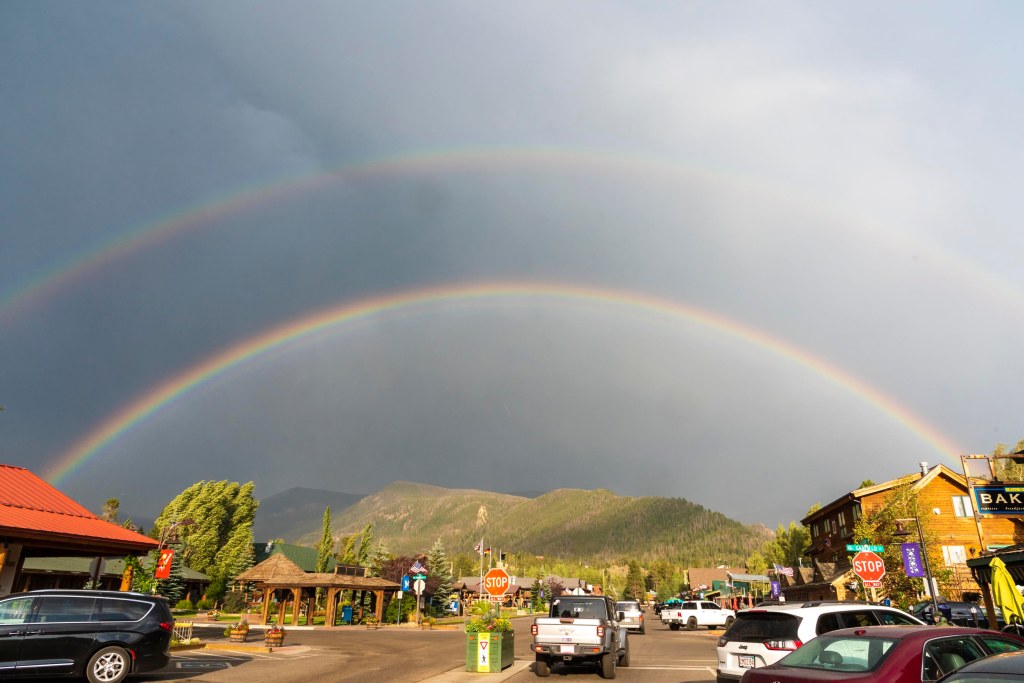 By the time we left the park we were ready for dinner! Luckily, Grand Lake is not far from where we left the park. There are a lot of restaurants there, but when we saw one called One Love Rum Kitchen we knew we had to eat there; with the words Love and Rum in the name, it had to be good, right?!? And it was! We got the spicy Margaritas which were excellent, and some of the best fish tacos we have ever had! Although the weather had been beautiful all day, it did rain while we were eating, which was okay since we were under cover. And then we were treated to an amazing double rainbow!!!