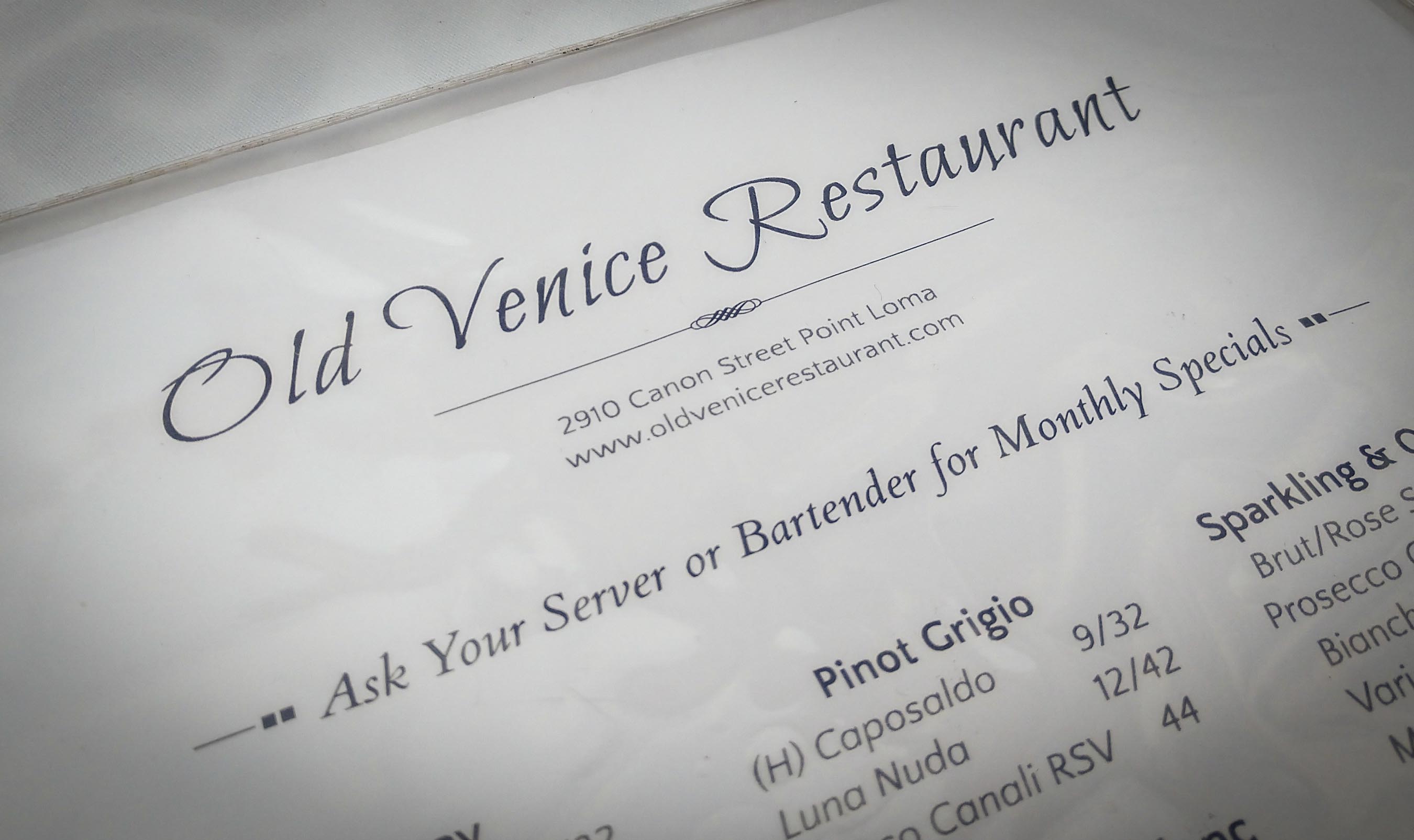 Since we definitely got our steps in that day we decided to go out for one more nice dinner. Years ago, Mike had spent a lot of time working in San Diego. He remembered a small off-the-beaten-path Italian restaurant he had always enjoyed out near Shelter Island. Fortunately, we found out that the Old Venice Restaurant still has great food!