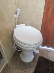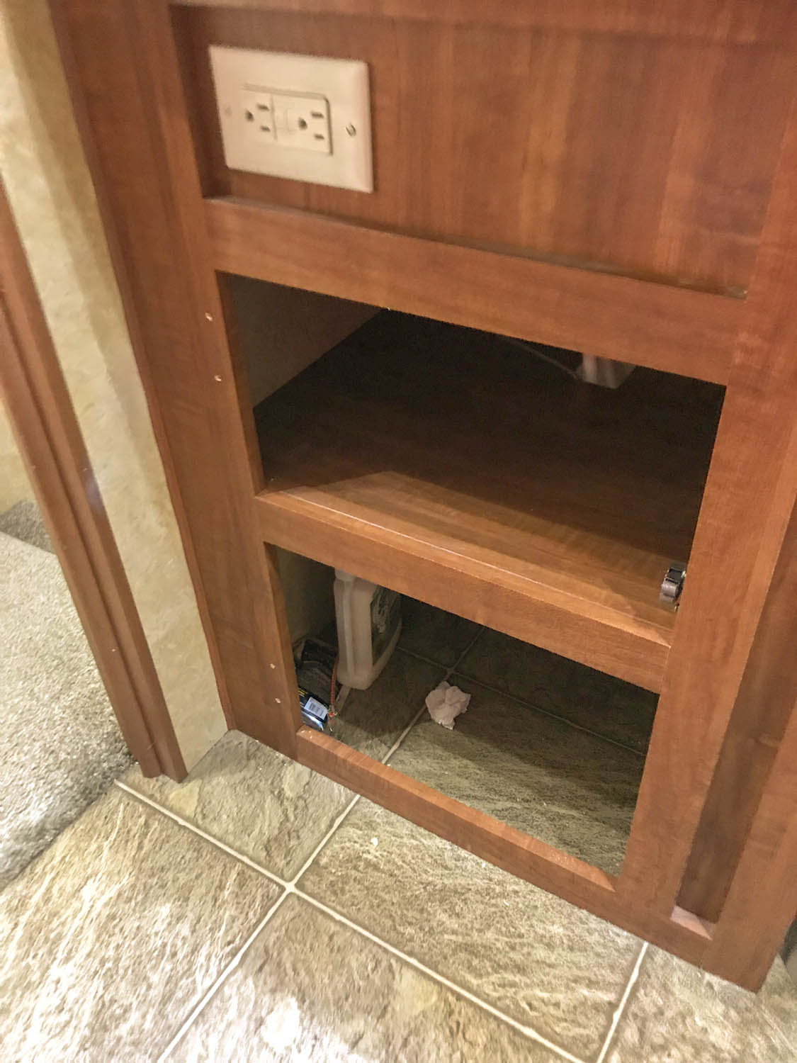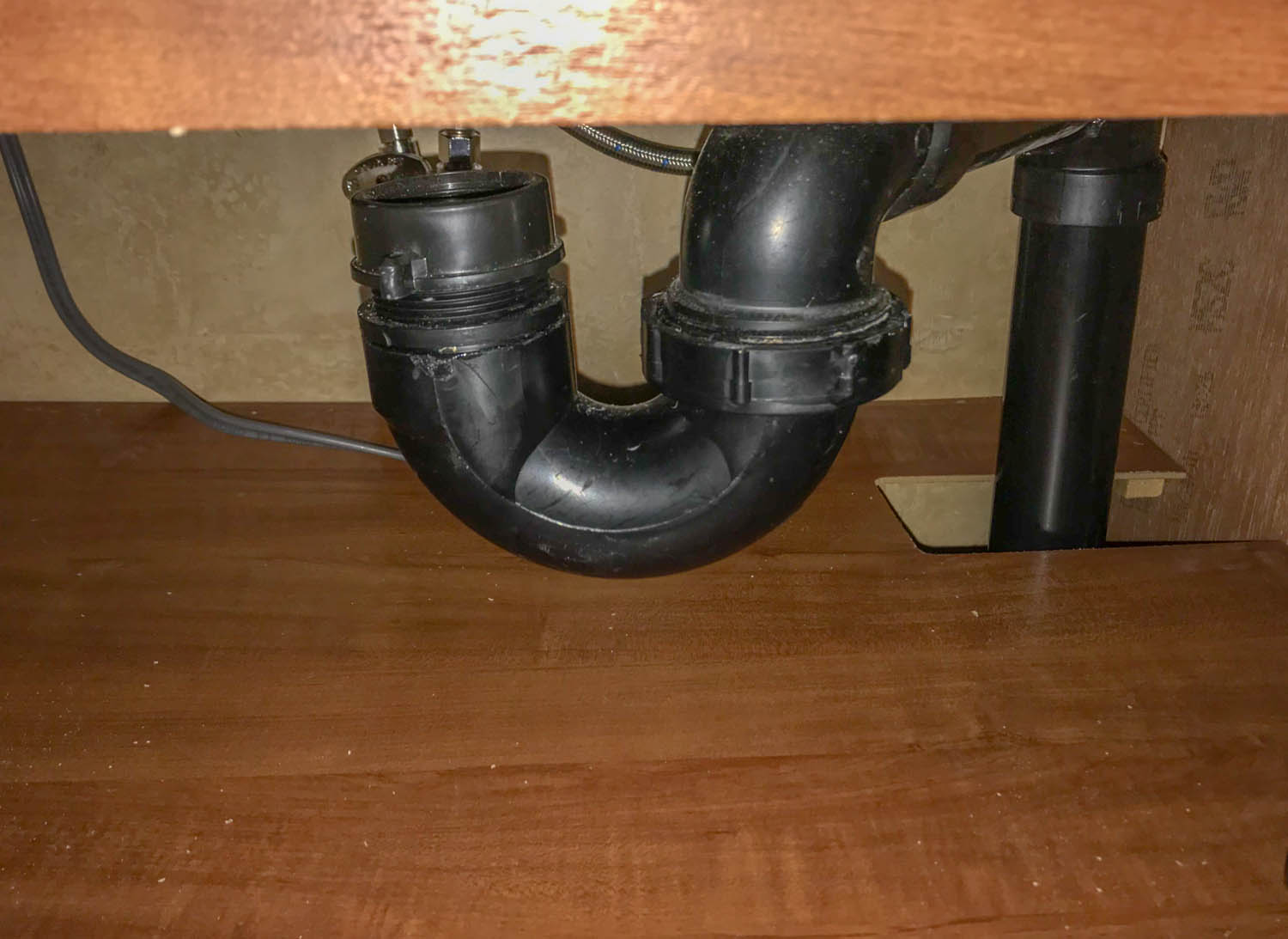 Fortunately for us, we went to the Hershey RV show and there was a vendor there representing the HepvO Sanitary Waste Valve. It’s a pretty unique device, very simple in design, that totally eliminates the need for a P-trap. So that is what I installed to open up the space underneath the sink for more storage. (Which BTW, I also did to our kitchen sink opening up more usable storage in that cabinet also!)