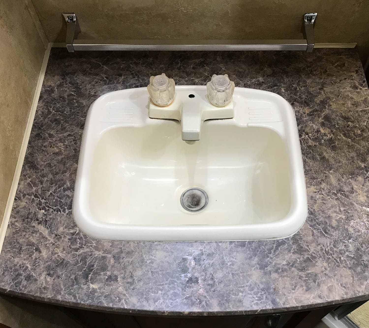 We really didn’t like the plastic “RV” double sink that came with the camper and knew eventually we’d want a residential style sink. I’ve never put one in before but figured I could do it. We bought one at Home Depot and the only real difference was we bought one with a 7” deep bowl instead of what appears to be a standard of 8” deep.