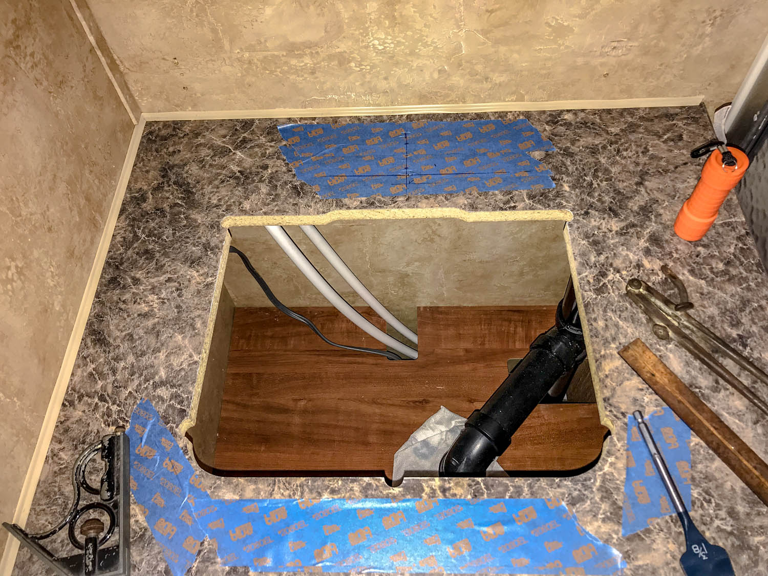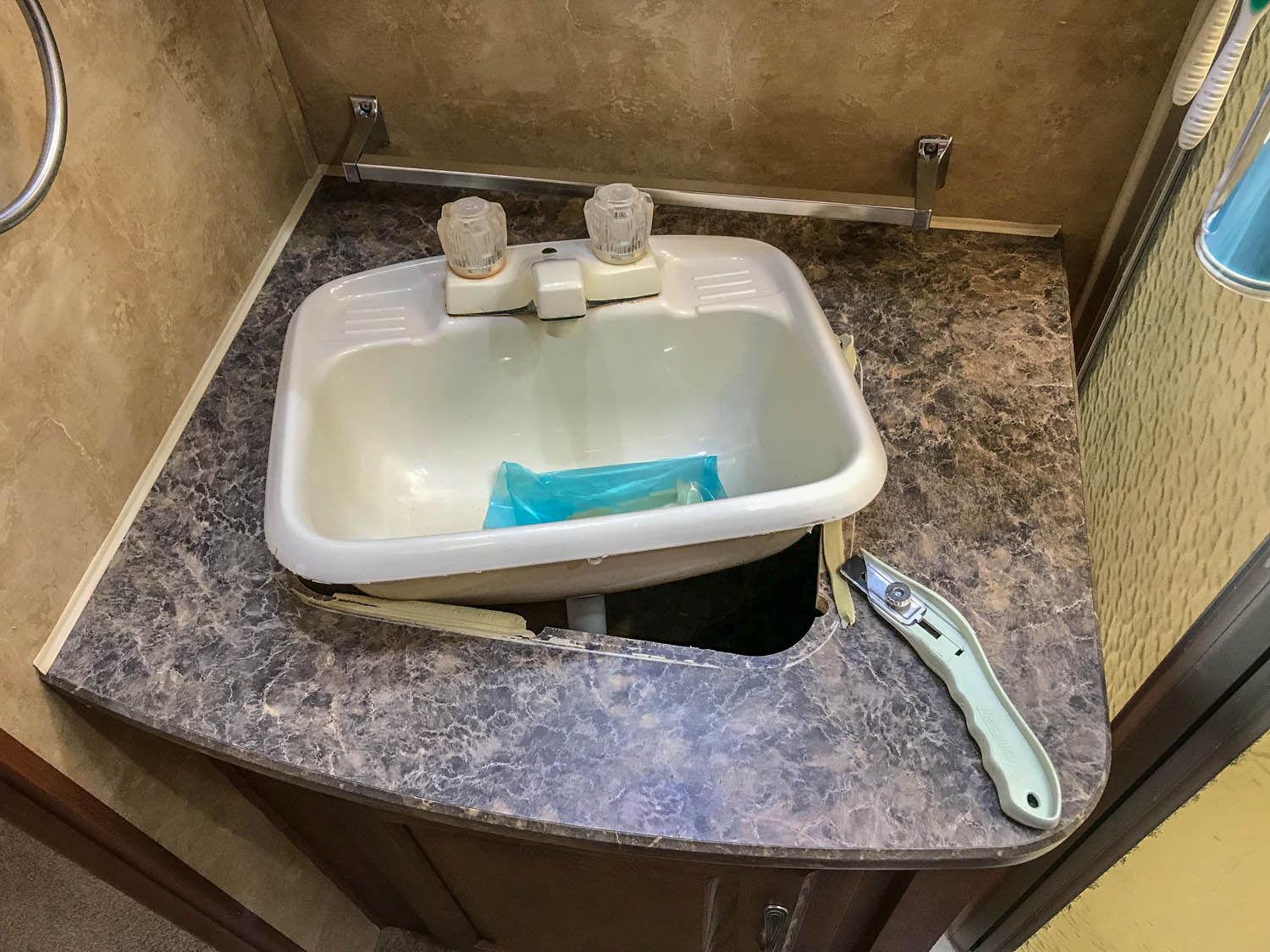 Next, remove the sink. Ha, you think this is easy?!?! What can it be, remove a couple of screws, lift it off, done! … Till you realize they must use some kind of earthquake proof super glue adhesive type plumber’s putty that absolutely, positively WILL prevent your 2 lb. plastic sink from ejecting out of the cabinet in the event you roll your rig over ONTO the TOP OF a SATURN 5 ROCKET, while it is exiting the stratosphere, on its way to Mars! Needless to say, a straight edge razor and some gentle prying is your friend.